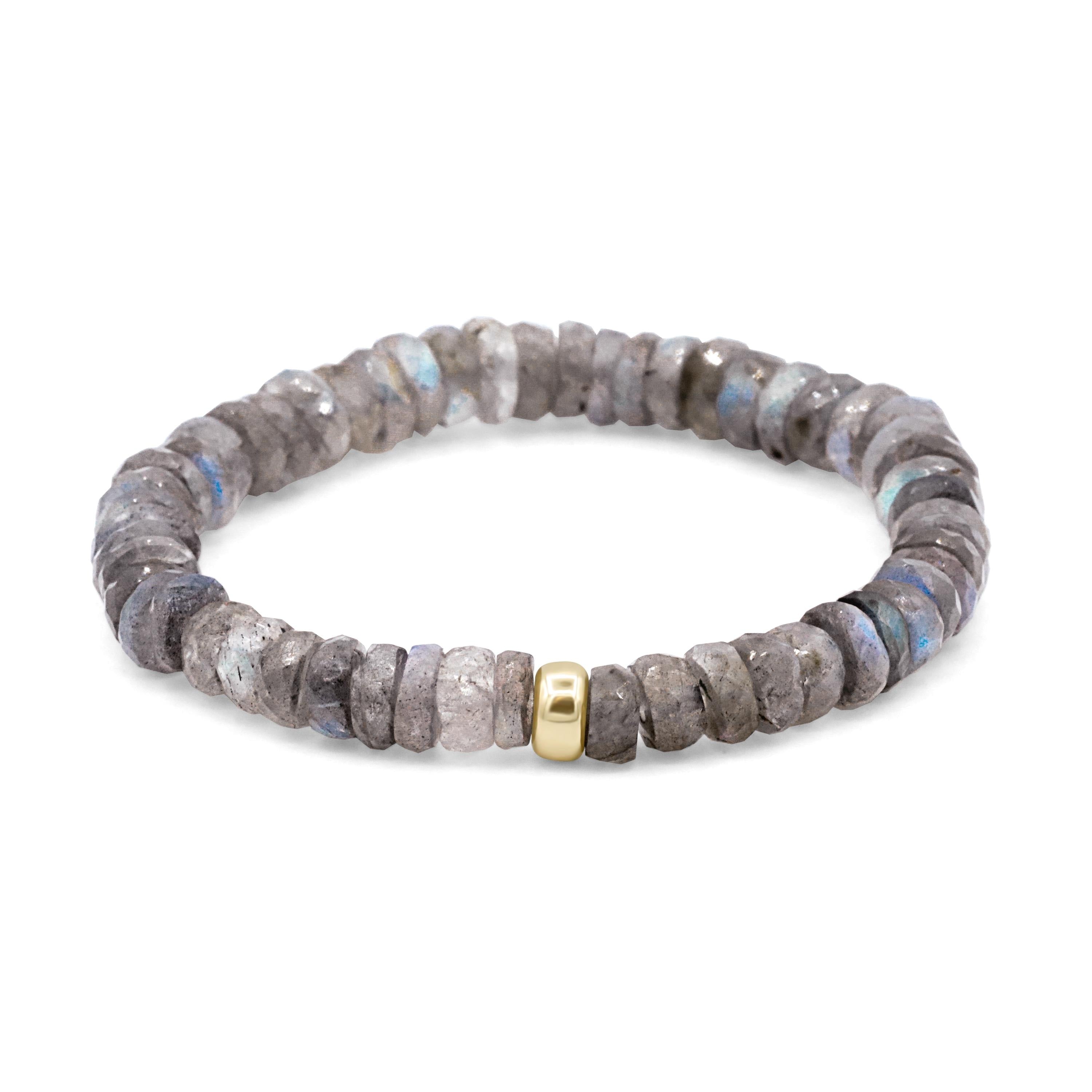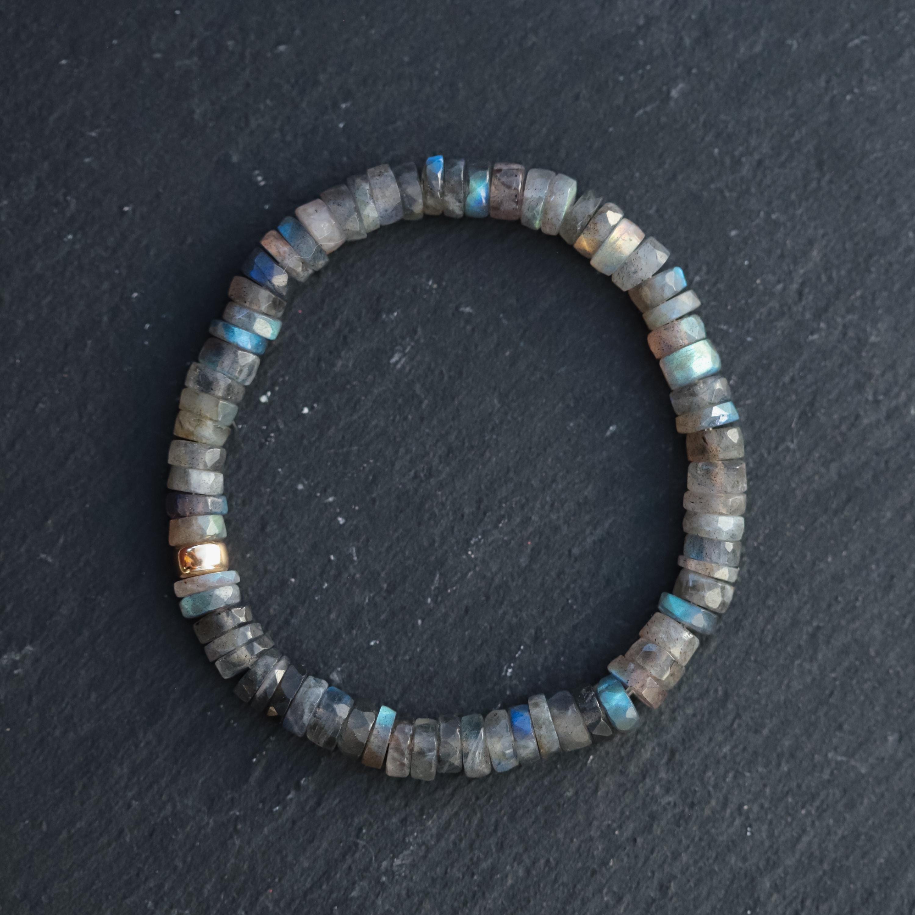 This faceted heishi Labradorite bracelet radiates mystical elegance. With every movement, flashes of blue, green, and silver shimmer through the stones — like glimpses into a hidden realm. Known as a stone of wisdom, spirit, and intuition, Labradorite adds an enchanting touch to your everyday look.