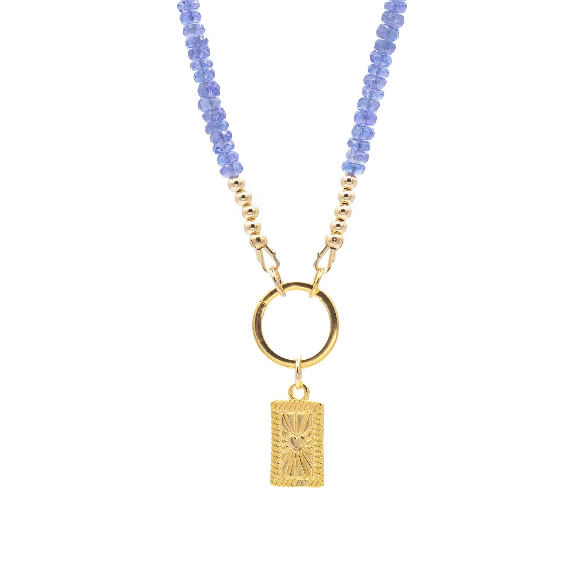 A strand of luminous violet-blue tanzanite, crafted to capture the energy of transformation and truth. This four-piece design features a faceted gemstone strand, a 15mm gold carabiner, and two removable charms — a sparkling white topaz pendant and a radiant heart burst. Each element reflects light, clarity, and the beauty of change.