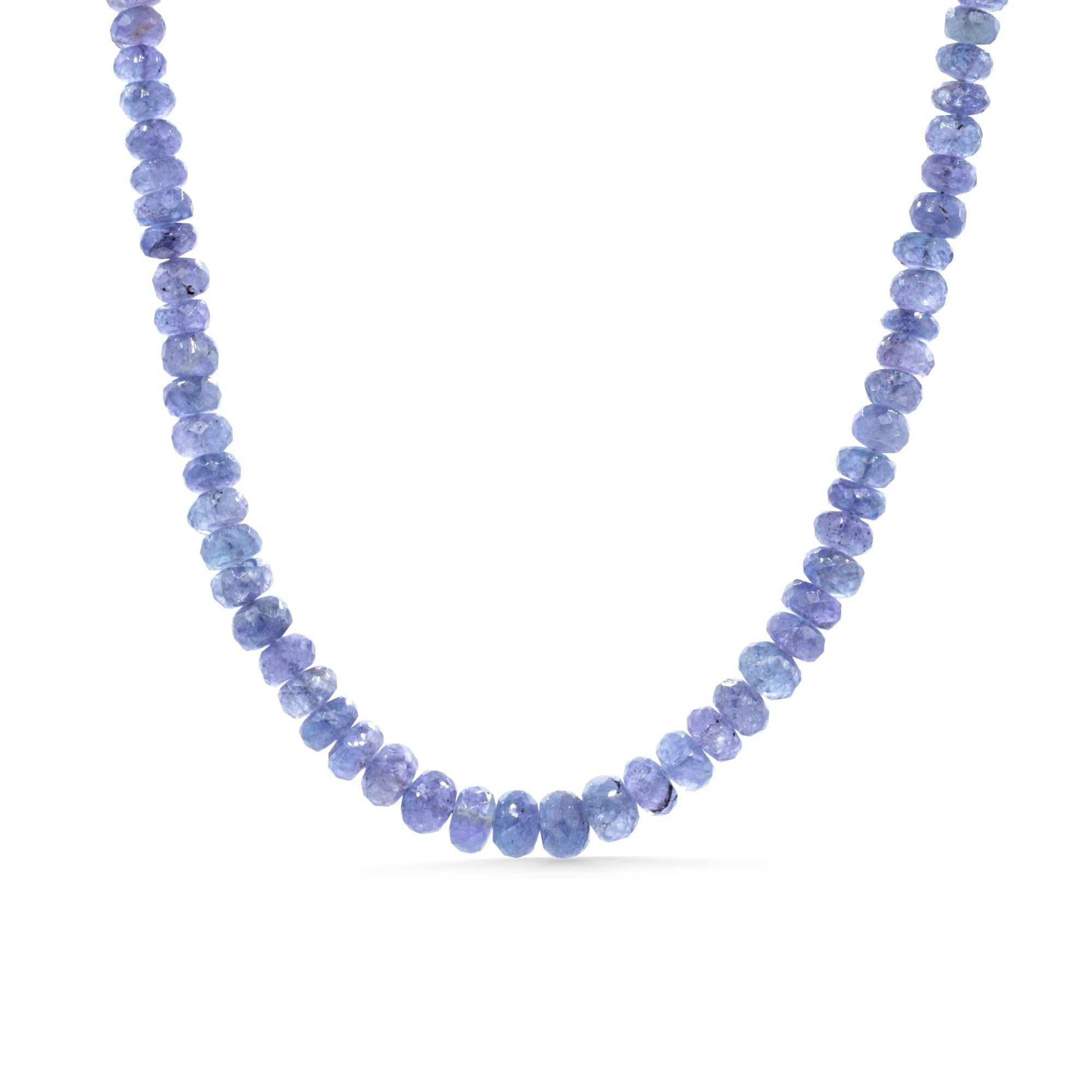 This elegant strand features AAA+ tanzanite in a luminous faceted rondelle cut, known for its soft clarity and tranquil presence. Finished with a 14K gold filled clasp, it’s a timeless piece that brings a subtle glow and meaningful energy to your everyday wear.