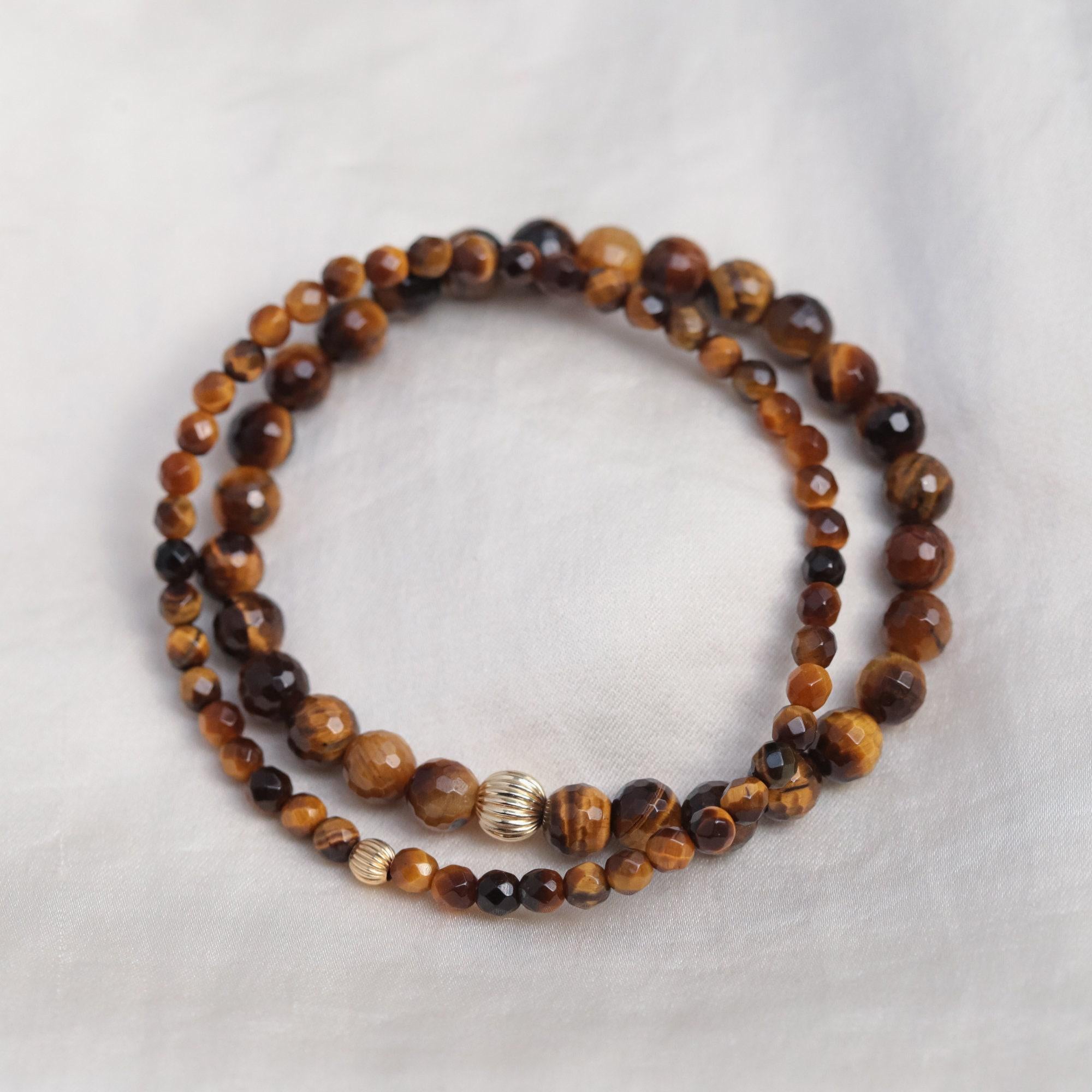 • Handmade in Vancouver • Genuine faceted tiger’s eye – choose 4mm or 6mm • 14K gold filled, sterling silver, or 14K solid gold accent • Durable stretch cord – no clasp • 100% genuine gemstones
