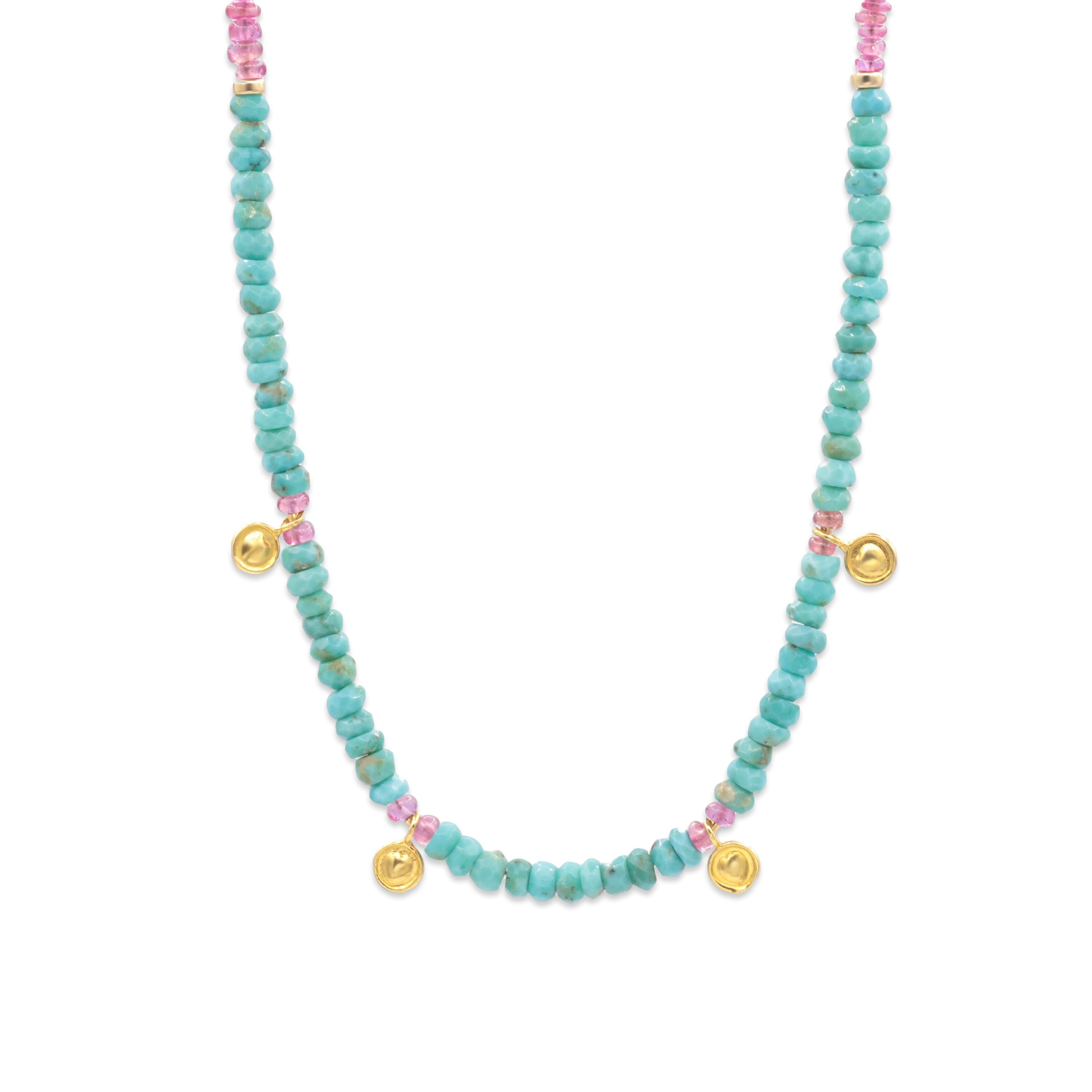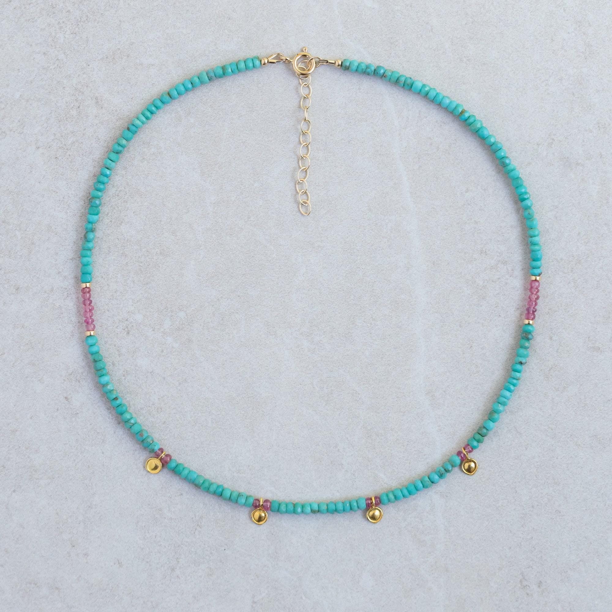 A vibrant pairing of two powerful stones—Arizona turquoise and gemmy pink sapphire—this necklace balances grounding strength with heart-centered clarity. Faceted turquoise brings healing and wisdom, while soft pink sapphire opens the heart with love and forgiveness. Finished with gold vermeil pendant accents and a 14K gold filled extender for an adjustable fit.
