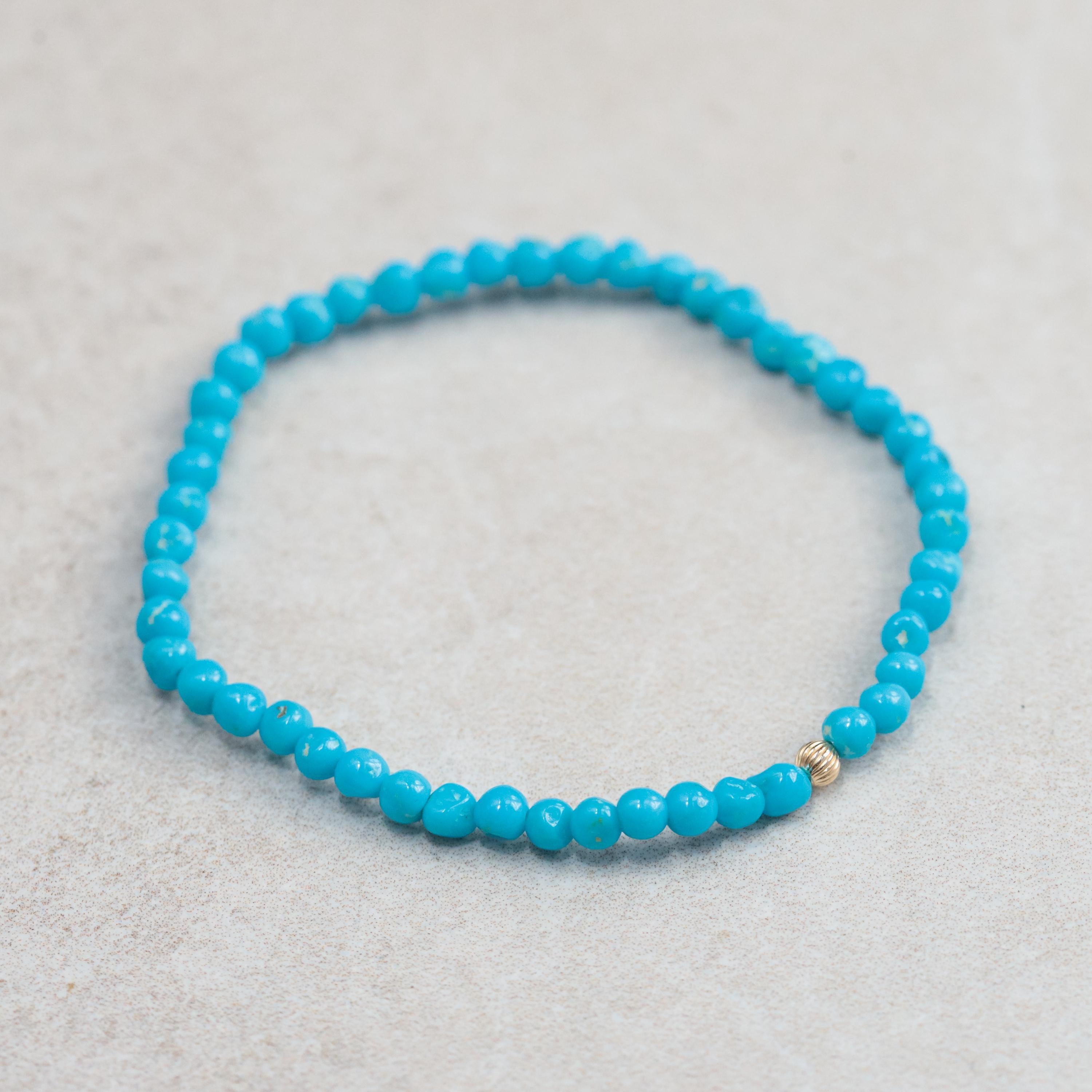 Crafted with tiny nuggets of natural Sleeping Beauty turquoise, this stretch bracelet offers a brilliant pop of color in a soft, stackable silhouette. Sourced from Arizona and completely undyed and natural, this turquoise is prized for its vivid, matrix-free hue. Finished with a luxe 14K solid gold corrugated bead, it's a perfect everyday piece—delicate, striking, and easy to wear.