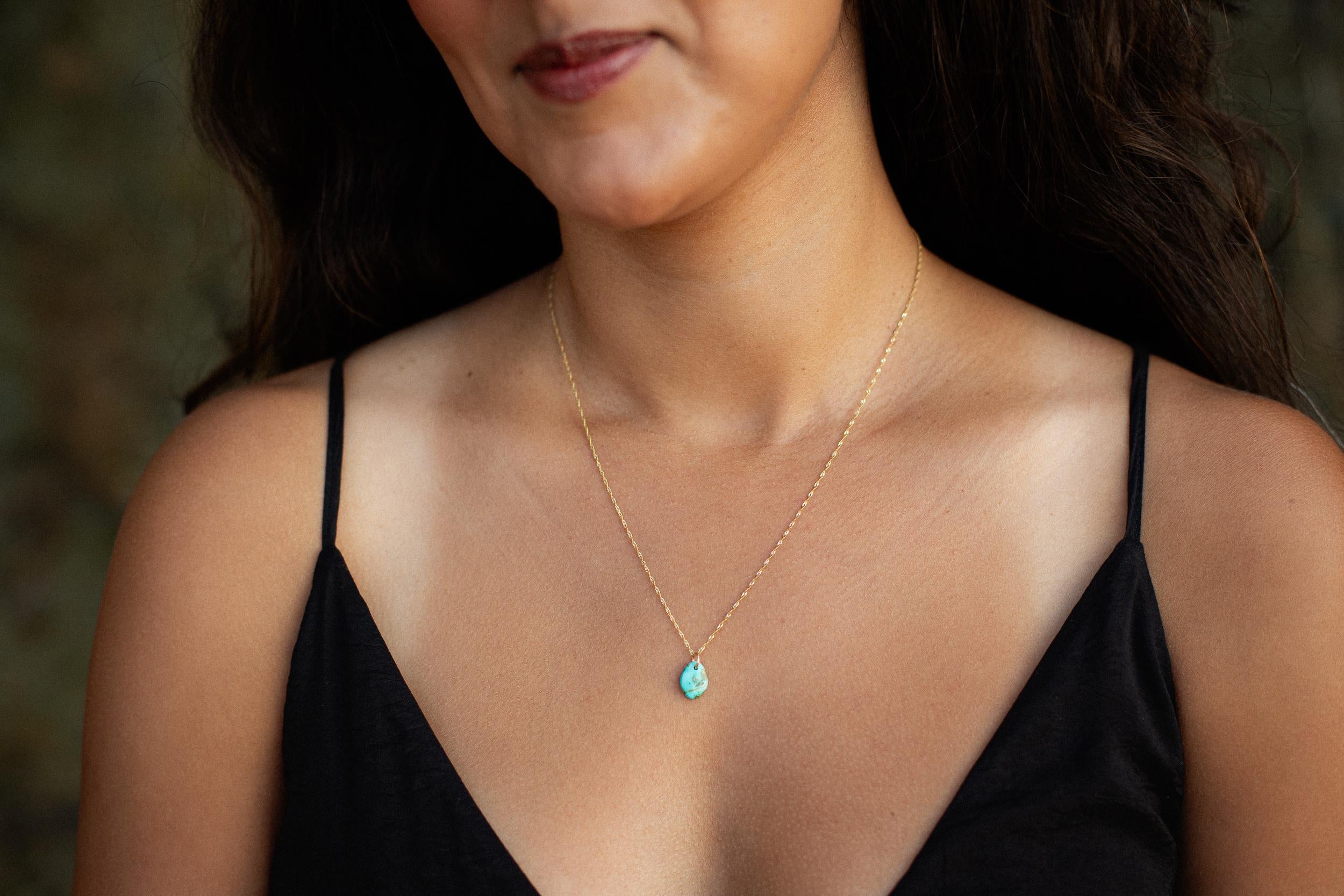 A timeless expression of natural beauty. This one-of-a-kind necklace features a genuine turquoise pendant, organically shaped and left completely untreated. Each stone carries its own surface texture, mineral patterning, and unique tonal variation — a raw, soulful reflection of the earth’s natural artistry.