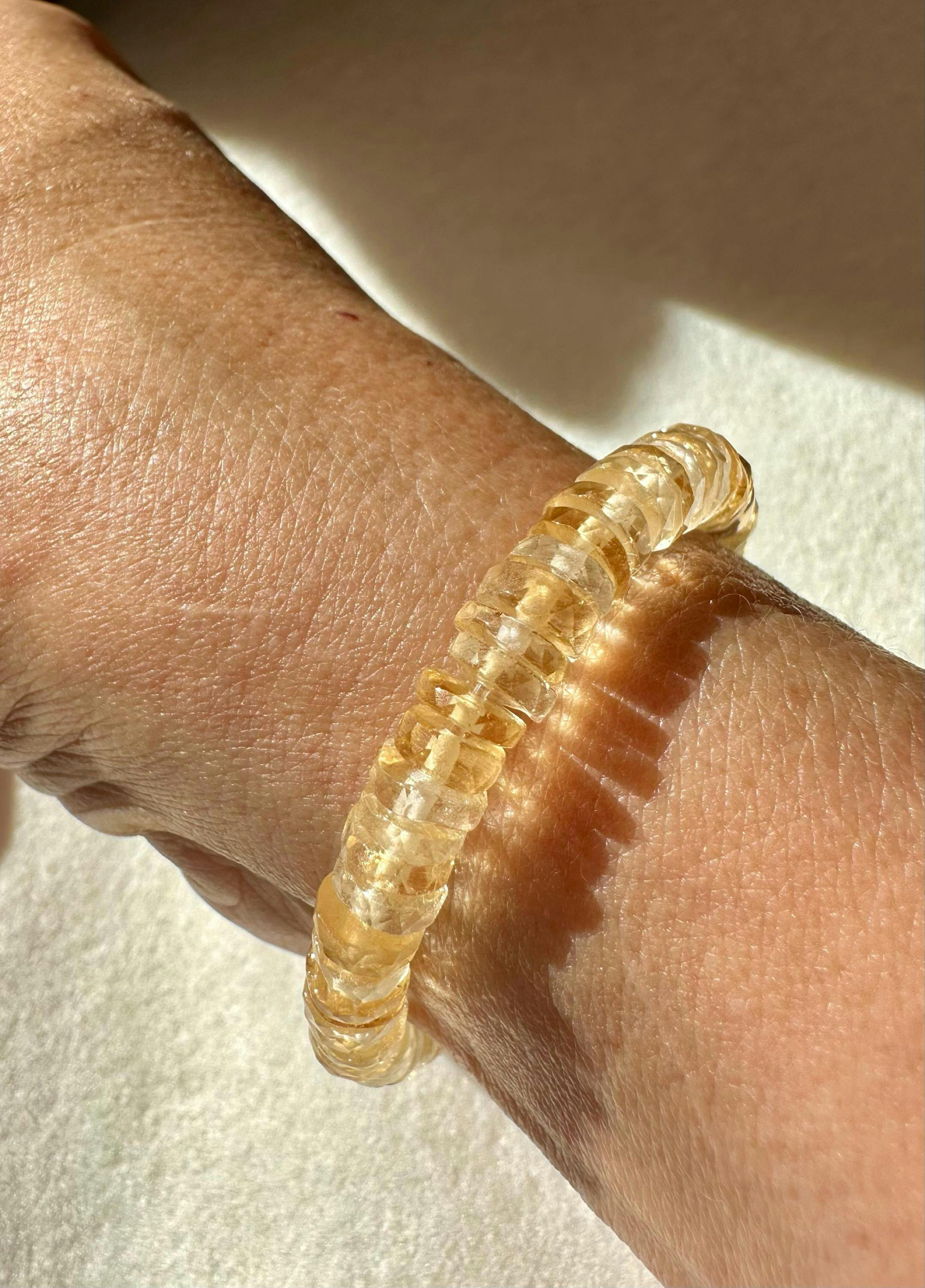 This luminous bracelet features faceted ombre citrine in a rare heishi cut—each bead glowing with warm, golden energy that gently shifts in tone. Finished with your choice of 14K gold filled, sterling silver, or solid 14K gold rondel, it's a vibrant yet refined piece designed to brighten your day and uplift your spirit.